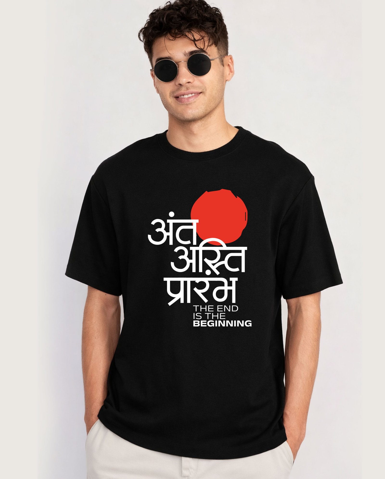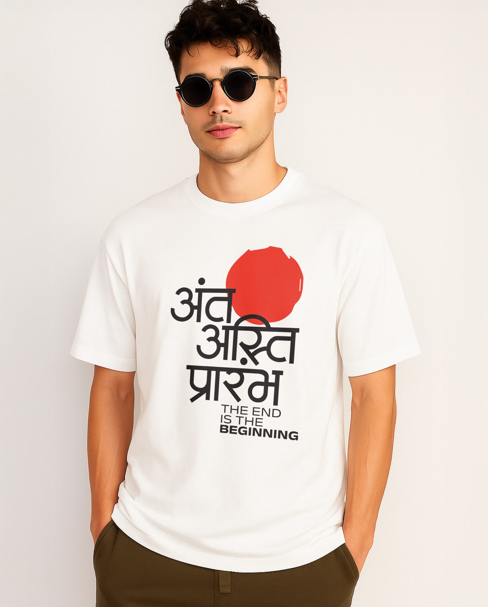 The Antah Asti Prarambh T-Shirt follows a minimalist design philosophy—simple, clean, and timeless. Instead of loud graphics, the power lies in the message itself.